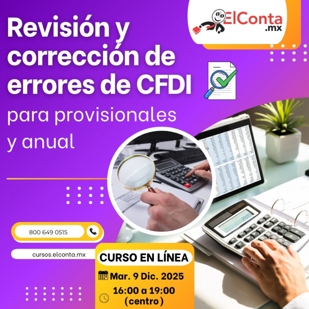 Detecta y corrige errores en tus CFDI´s, deduce y paga tus contribuciones correctamente y en tiempo. La entrada Mar. 9 Dic. Pagos provisionales / Declaración ANUAL. Revisión y corrección de errores de CFDIs – Curso en línea 100% En VIVO!! se publicó primero en ElConta.MX Cursos en línea.