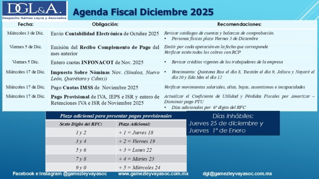 DICIEMBRE 2025. Agenda de Obligaciones Fiscales, Laborales y de Seguridad Social.