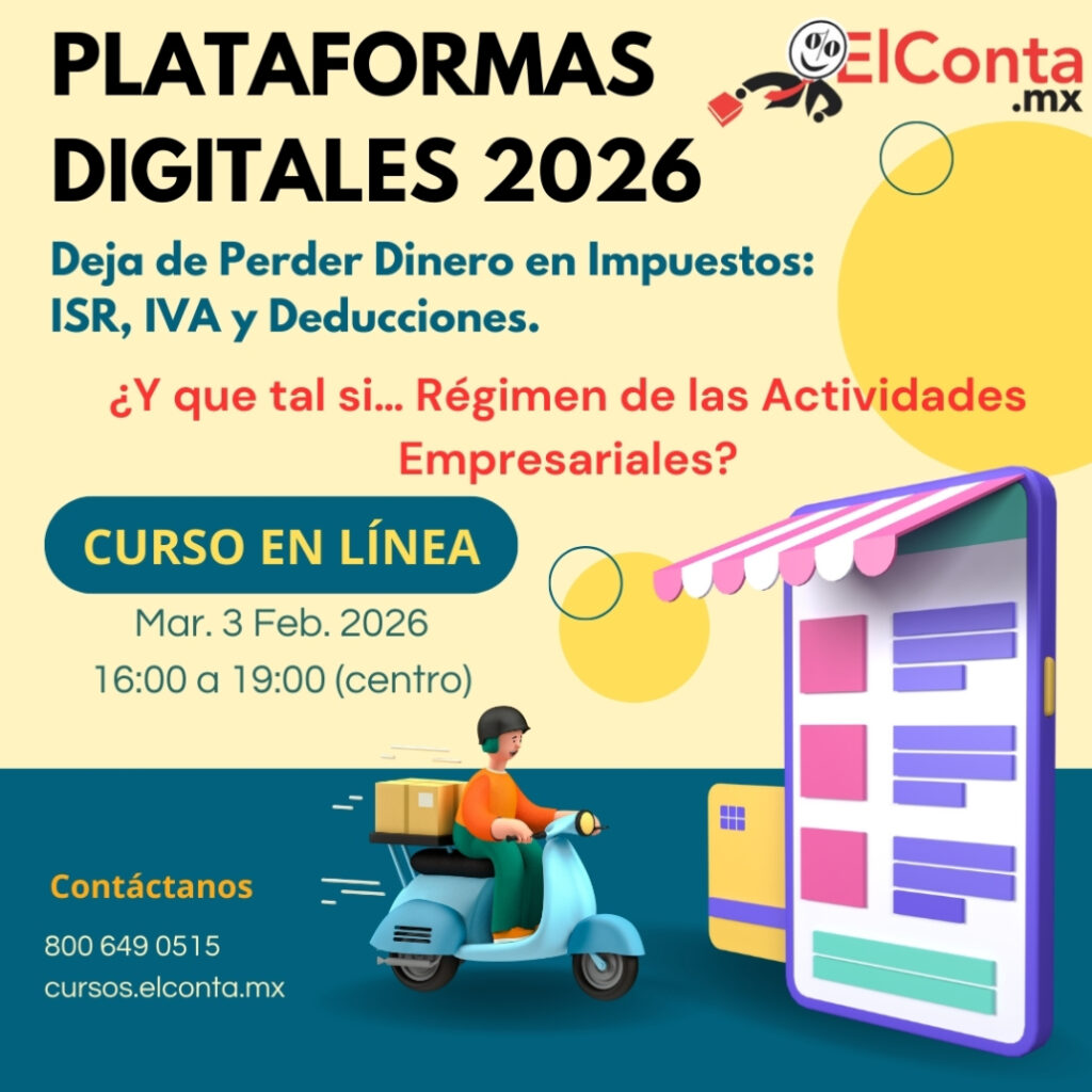 La entrada Mar. 3 Feb. Plataformas Digitales 2026. Deja de Perder Dinero en Impuestos: ISR, IVA y Deducciones. Curso en línea 100% En VIVO!! se publicó primero en ElConta.MX Cursos en línea.